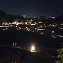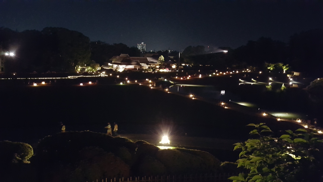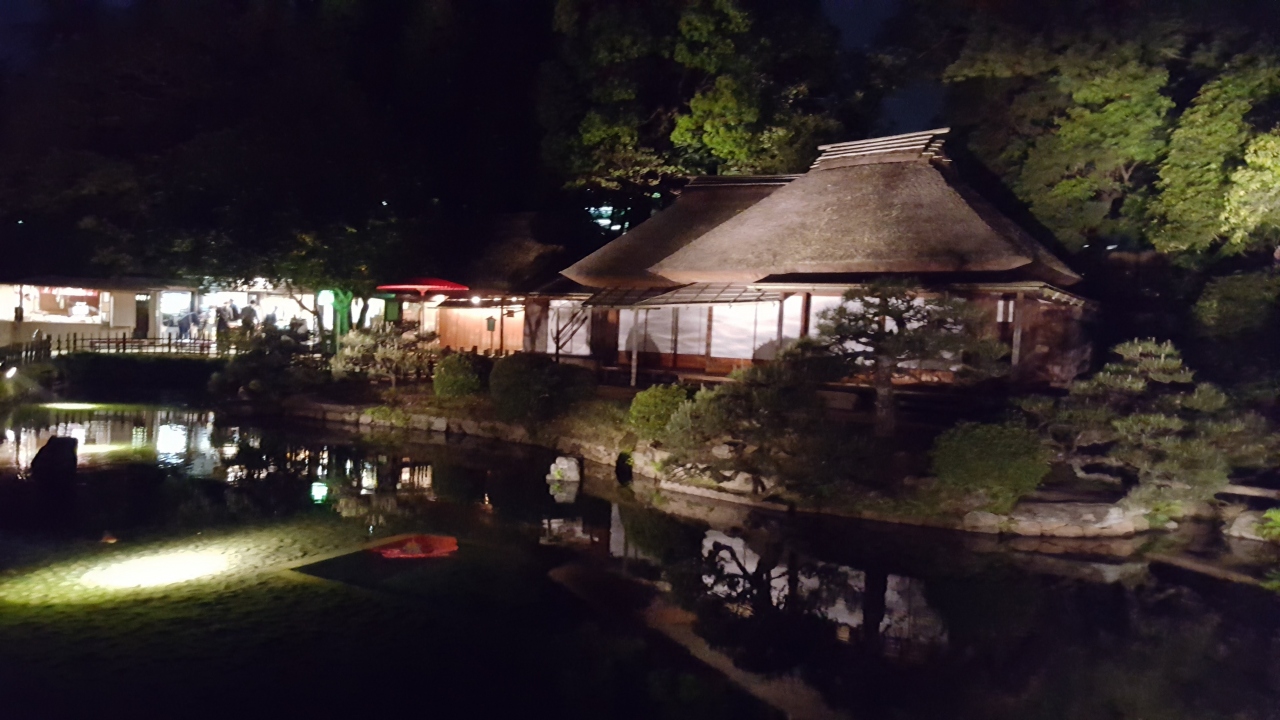 5月6日(日)までの期間限定で、春の幻想庭園と題して、夜の9時まで開放してます。料金は昼と変わらず400円。足元結構暗いので気を付けていきましょう。若干見ずらいですが、確かに幻想的です。同時期に岡山城も同等の催しをしているのでセットで行くとよいでしょう。