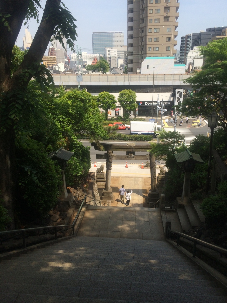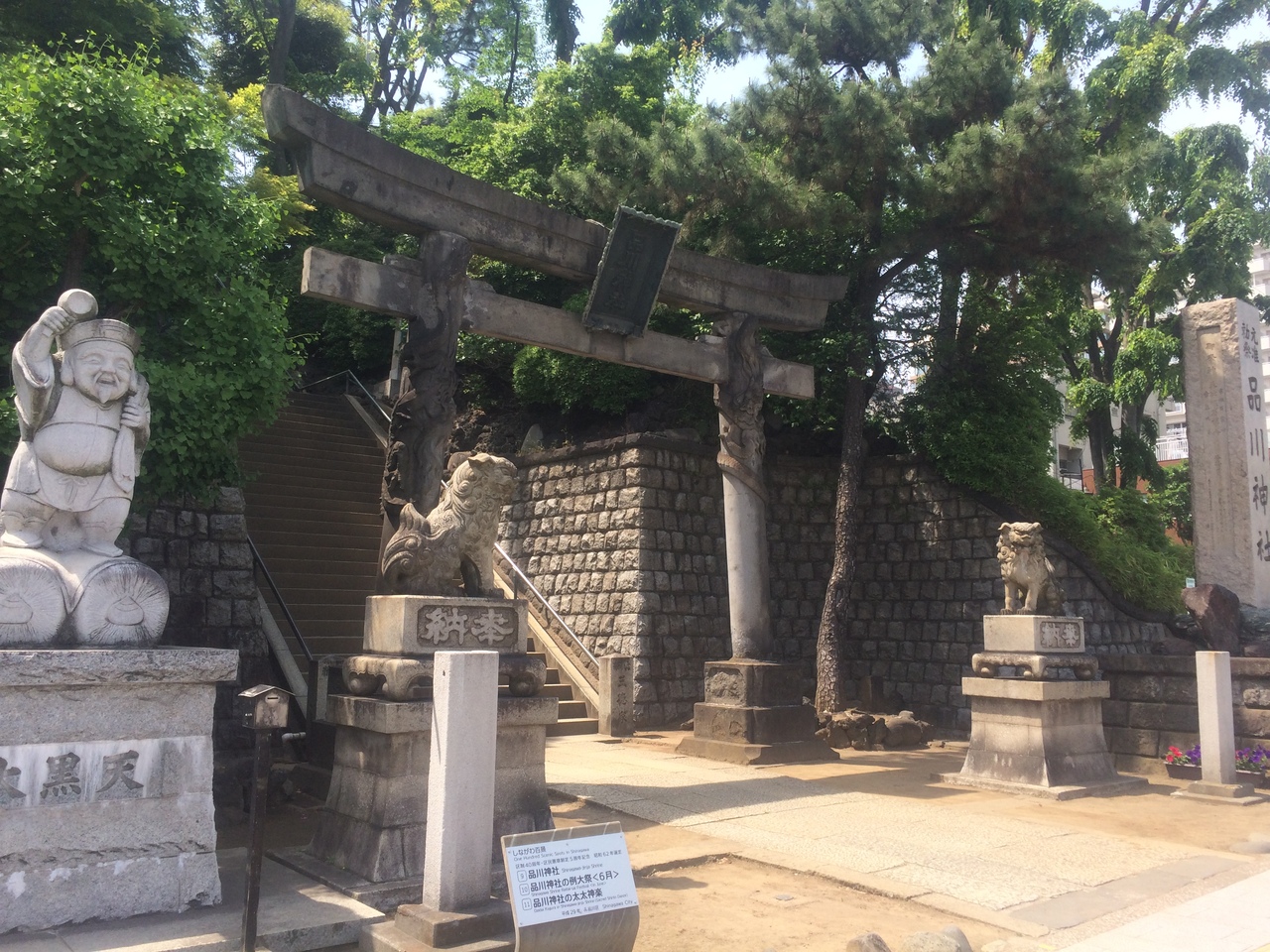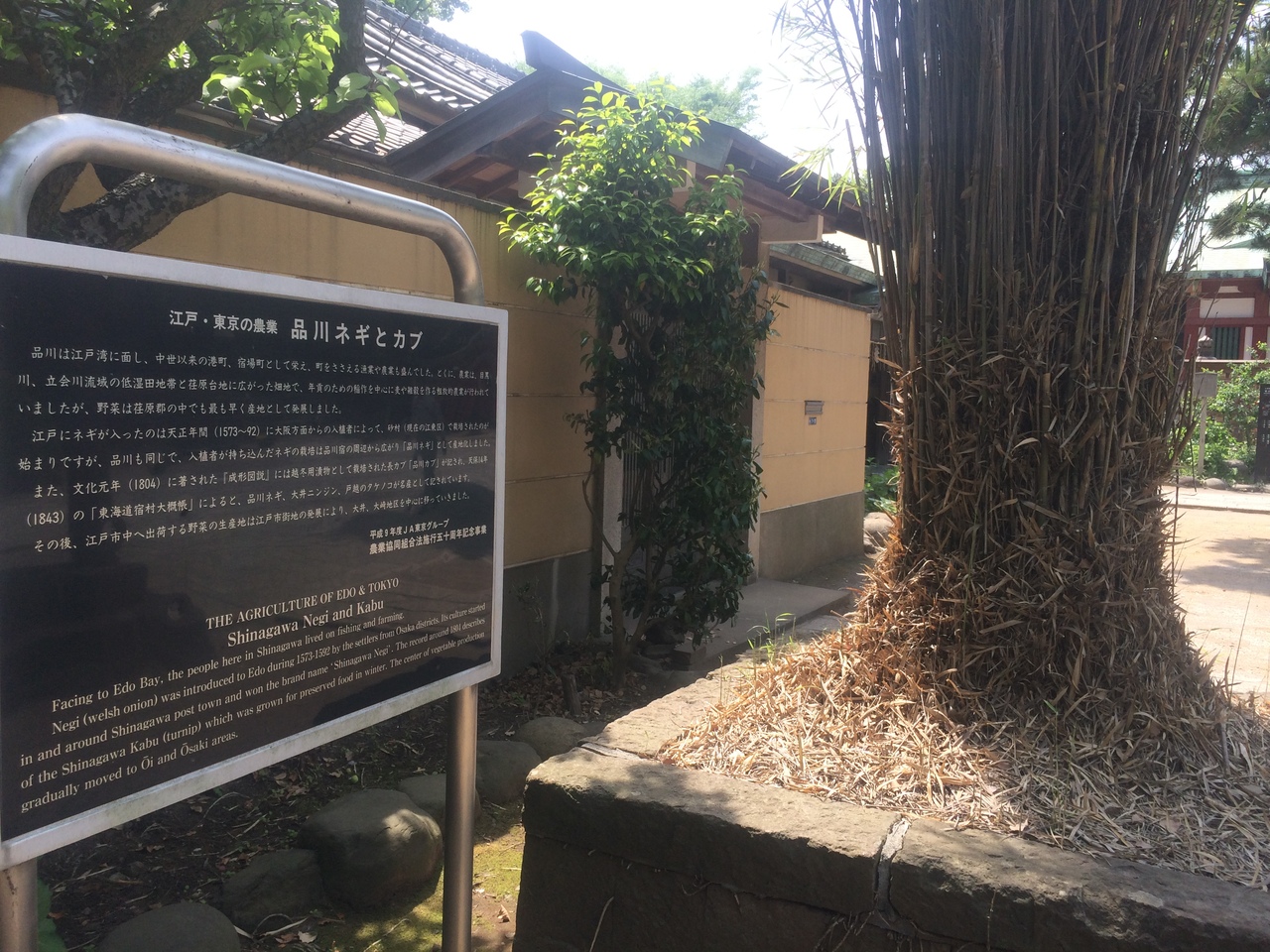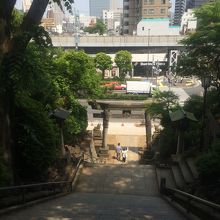 1分もかからず上れますが階段が急でした。境内が少し高台にあるので品川のビル群を望むことが出来ます。品川周辺の雑踏が嘘のような静かな場所でした。江戸時代の宿場町だけあって、包丁塚、ネギとカブの説明看板等がありました。