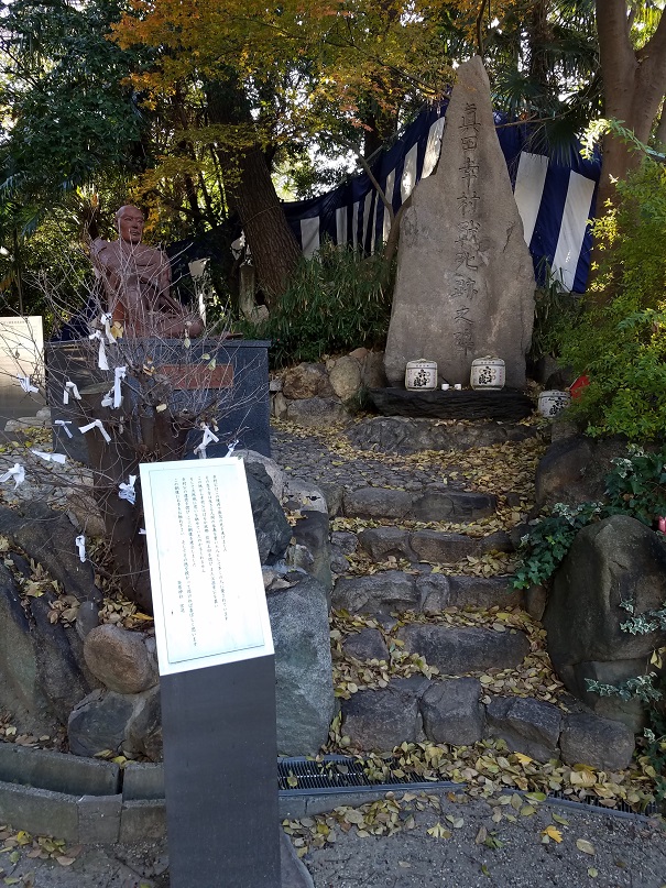 安居神社の境内に真田幸村戦死跡之碑と共に銅像がありました。