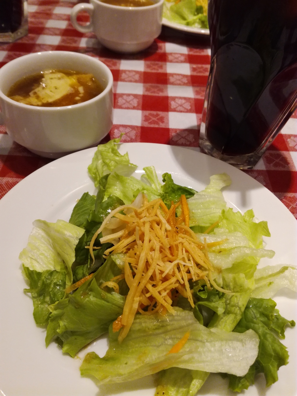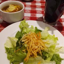 オニオングラタンスープ、サラダ、ドリンクと好きなメイン料理で税抜きで980円位でした。私はパッタイを選びました。