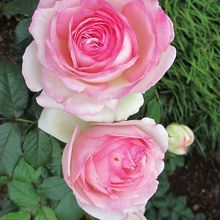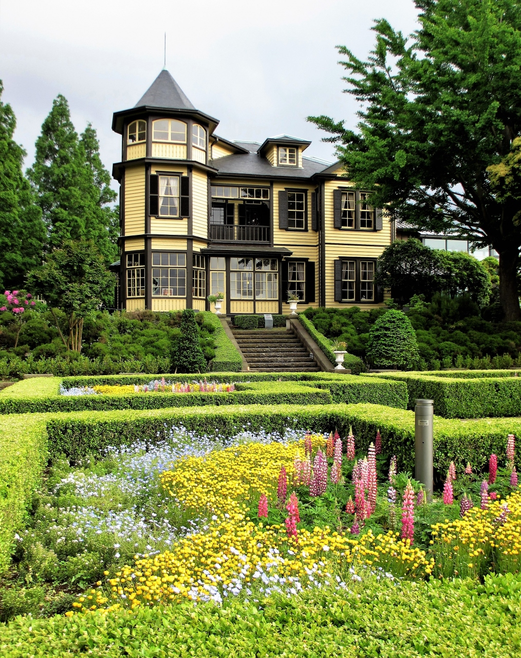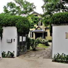 展望塔もあるかわいい建物です。庭にはバラが咲いています。