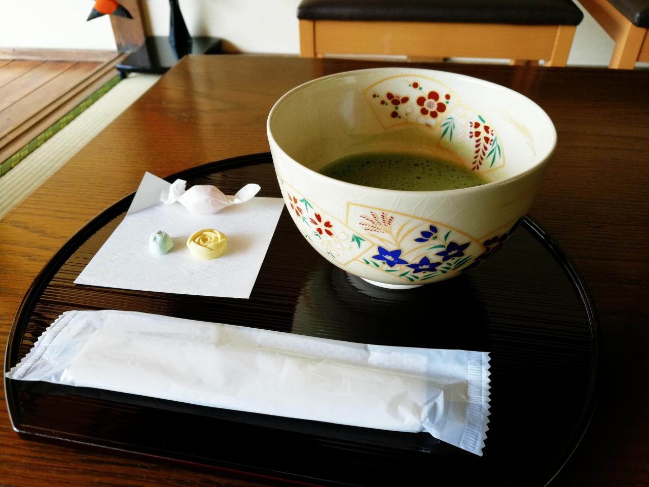 和室に座って和三盆の茶菓の付いた抹茶をいただきながら、この本格的な日本庭園を眺めることもできます。