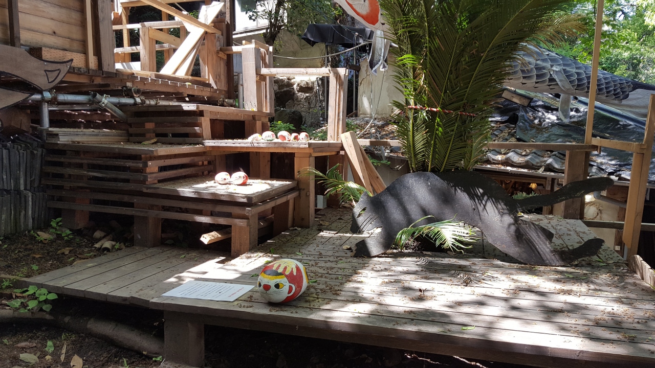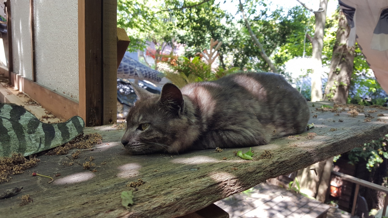 猫のオブジェがたくさん置いてある日陰の小道(坂道)です。千光寺の坂の途中にあるので、行きはロープウェー、帰りは徒歩でこちらによるのが楽です。本物の猫にも会えました。ちょうど塀でお休み中。猫をモチーフにした雑貨店があったりします。