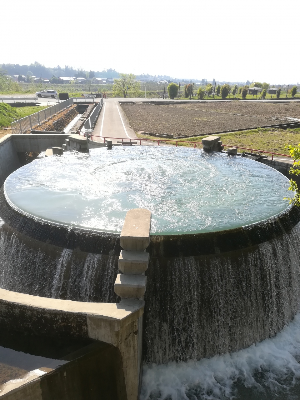 この地は水持ちが悪く農業用水を巡って争いが絶えなかったので、公平に水を分配する為に作られたものです。片貝川の川底を水路トンネルで対岸から水を通し、サイフォン原理で円筒分水に水を吸い上げています。辺りは農地で何もありませんが、きれいな水をわき上がらせ、とうとうと流れる落ちる水を見ていると、なんだか落ち着きます。