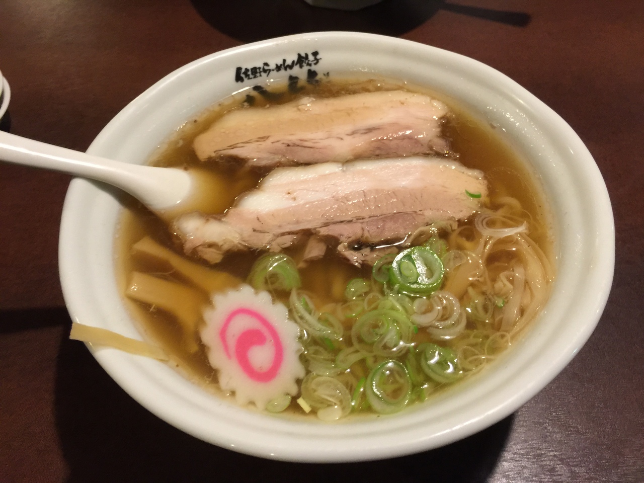 ラーメンはあっさり系スープに平打ちの太めの麺という佐野ラーメンらしい一品。塩と醤油があり、大きなチャーシューが載ってます。