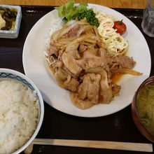 ランチメニューは黒板に書いてありますが生姜焼きは書いてないけどみなさん頼んでいたので注文。250gあるらしい豚肉は柔らかくニンニクが効いています。