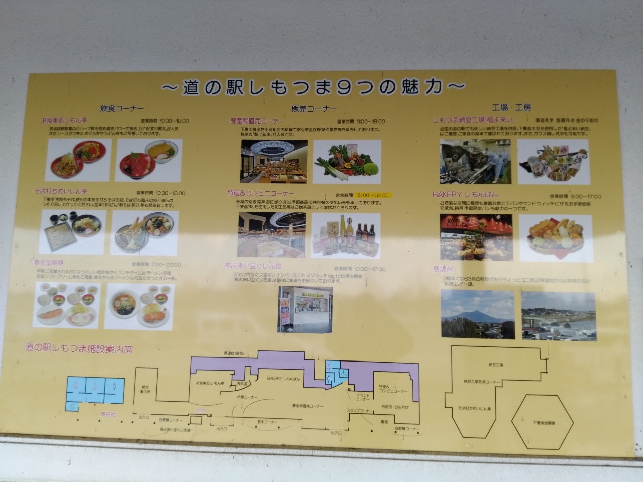茨城ドライブの終盤。「道の駅しもつま」で休憩としました。筑波山から降りてきて、国道294号線沿いにあります。道の駅の本館に農産物直売所があり。地元産のおにぎりや焼きたてパンがとても美味しそう。人も多くて賑やかな道の駅でした。