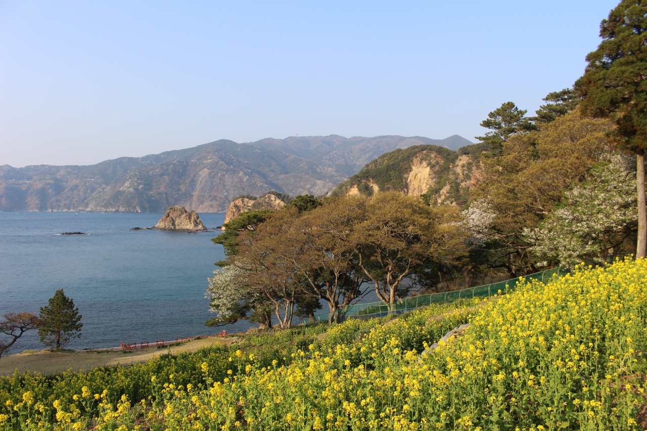 黄金崎は、黄金色になる岩の景勝地ですが、すぐ近くの公園には桜も植えられており、桜の名所でもあります。