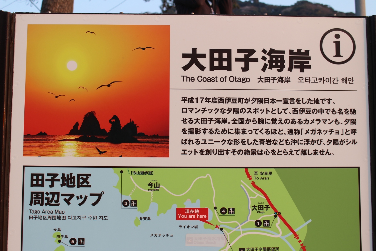 西伊豆・松崎に行った際、当初黄金崎で夕日を見ようと思っていましたが、周辺の観光マップで惹かれた夕日の景色が大田子海岸でした。