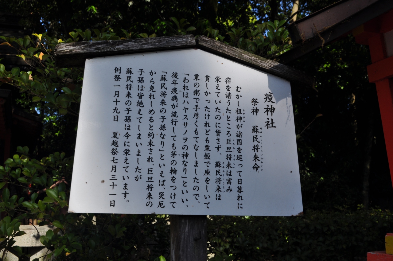 疫神社は八坂神社の西の西楼門を入ってすぐ正面にある境内社になります。かつて祖神が諸国を巡っていた際、夕暮れ時になって宿を請うた際に、裕福な巨旦将来はこれを断り、貧しかった蘇民将来は手厚くもてなしたことから、後年疫病が流行した際に茅の輪をつけて「蘇民将来の子孫なり」と言えば疫病から逃れられると約束され助かったと案内板に書かれていました。全国各地で疫神社と名付けられた神社を見かけますが、初めて由緒を知ることが出来ました。小さな社でしたが良い勉強になって良かったです。