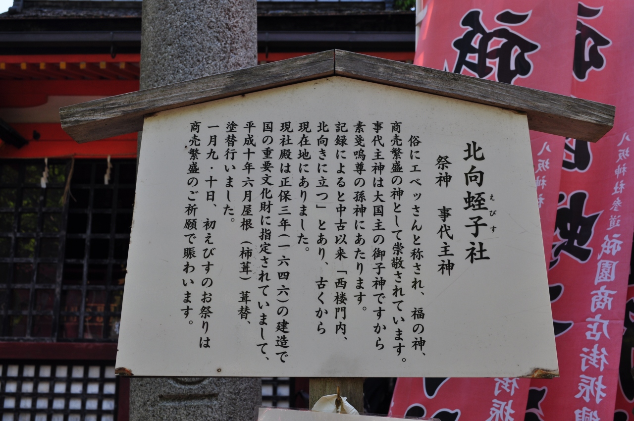 北向蛭子社は八坂神社本殿の南西に位置する神社になります。北向きに社殿が作られていることからこの名前が付けられたとのことです。こちらの神社には商売繁盛の神様「えべっさん」が祀られています。創建はかなり古く、平安時代までさかのぼるという記録もあるようです。また現在の社殿は1646年に建てられたもので、国の重要文化財にも指定されていました。個人的な商いはしていませんが、仕事の成功をこちらで祈願させていただきました。
