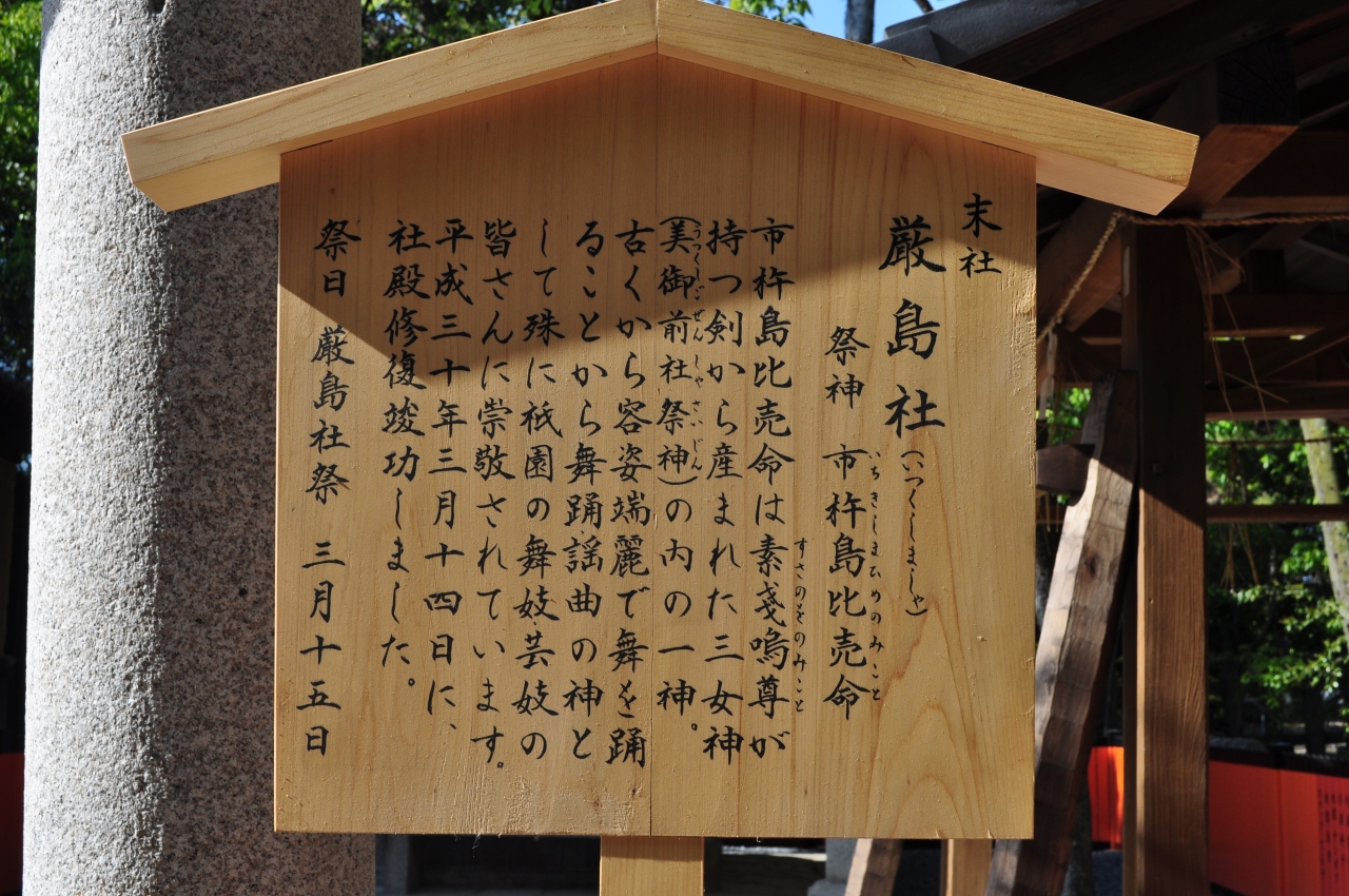 厳島社は八坂神社本殿の裏手にある神社になります。こちらの道を通る参拝客の数は少ないようで静かにお参りすることができます。てっきり広島の厳島神社と関係があるのかと思っていたのですが、こちらの厳島社は素戔嗚尊の剣から生まれた市杵島比売命を御祭神として祀っており、舞踊謡曲の神として祇園の舞妓芸奴さんから崇敬されているとの事です。平成30年3月14日に社殿を修復したとのことで、まだ1か月ほどしか経っておらず、非常にきれいな神社でした。厳島社というと全て広島の厳島神社が発祥かと思っていたので良い勉強になりました。