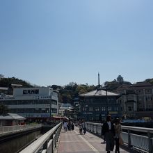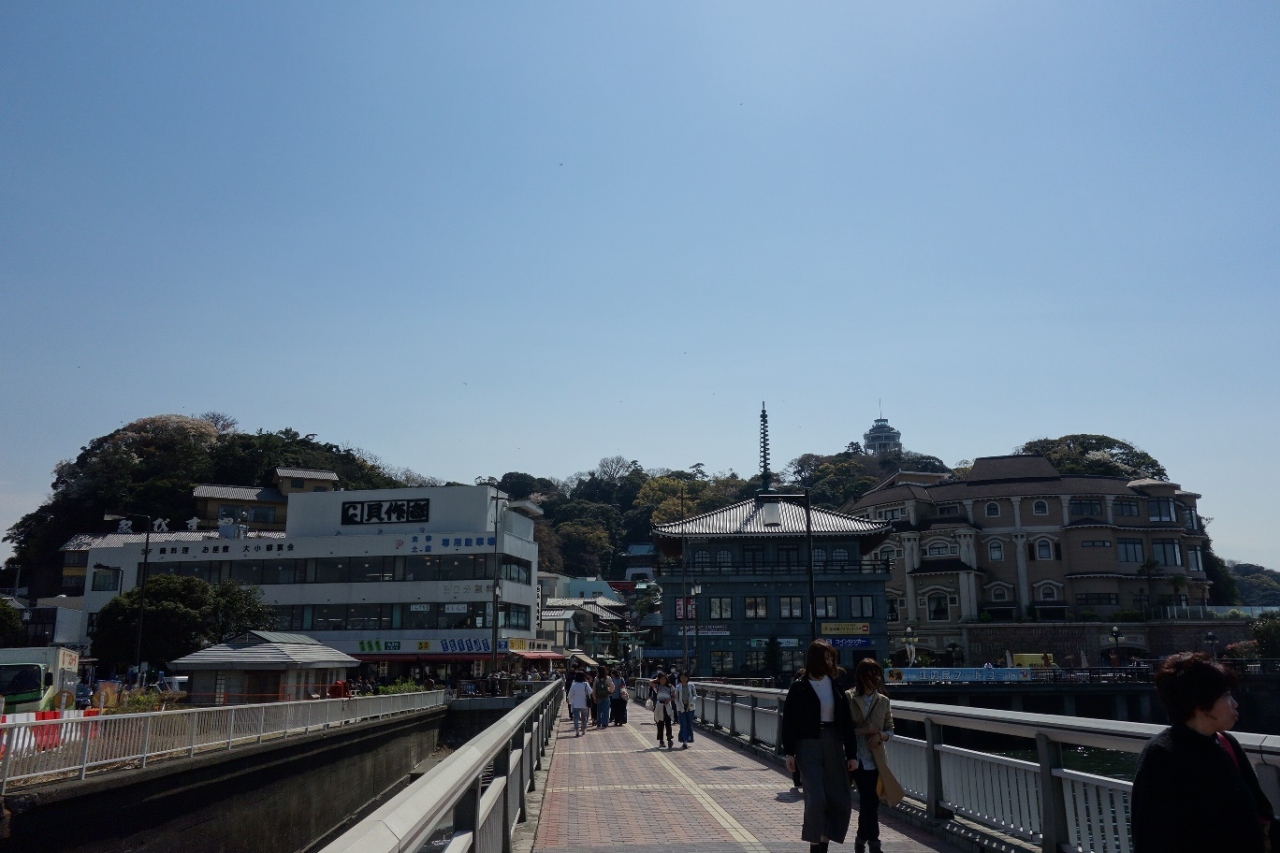 江の島駅側から江の島へ徒歩でアクセスする場合はこちらの弁天橋を渡って島へ入る形になります。ちょうど訪れた日は良い天気で江の島が大勢の観光客でにぎわっていました。そのためか橋の通行量も多く、さらに工事中だったため渋滞状態でした。