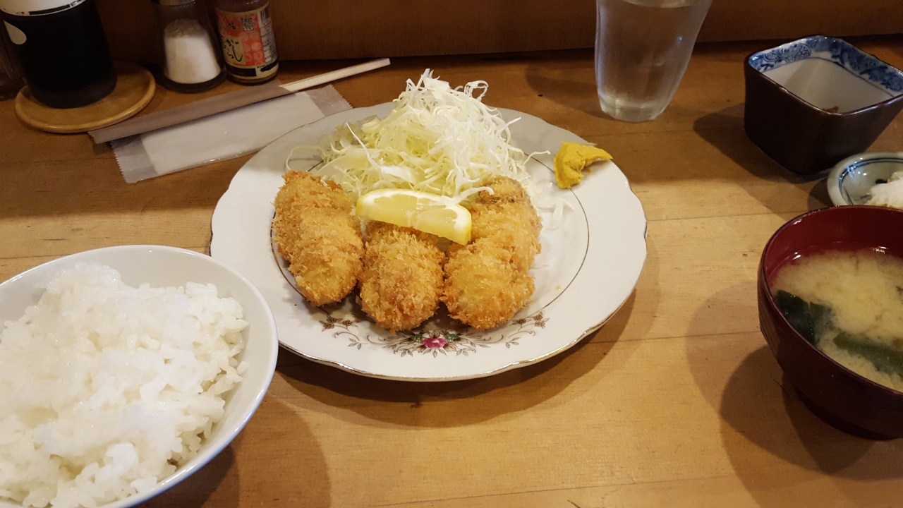 ランチで訪問。雷門通り店にあります。浅草寺から東に徒歩5分ぐらい。牡蠣定食がうまそうだったので入ってみました。写真の通り下記3個とちょっと少ないのよね。外の写真で見たら5個だったけど。ボリューム不足は否めない。1400円とお値段も高め。一粒一粒は大きくて味は抜群にうまかったけど。