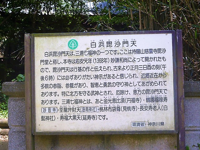 慈雲寺本堂から県道に戻る間に`毘沙門堂`にも寄りました(脇道で海岸沿いに)。やはり新緑の木々に囲まれた小振りの堂ですが石段/苔むした石灯籠もあり歴史を感じました;白浜毘沙門天の案内板があり、そこには`三浦七福神`お寺の紹介も。