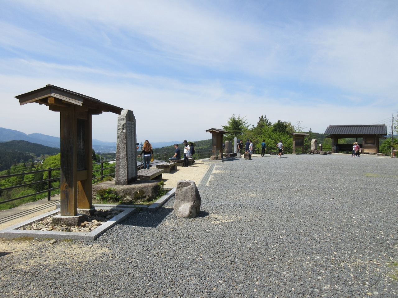 馬籠宿の石畳を上りきったところに造られている、砂利が敷き詰められた広場です。馬籠峠越えをしない人にとっては、馬籠宿観光の最高地点になります。広場内には休憩用のあずまやの他、島崎藤村の夜明け前の一節が記された碑や、馬籠宿が岐阜県の所有になった記念碑などが建っています。広場からは恵那山や多くの山々を望むことができます。馬籠バス停から石畳の坂道を上ってきた人たちにとって、気持ちが良い休憩場所と言えると思います。