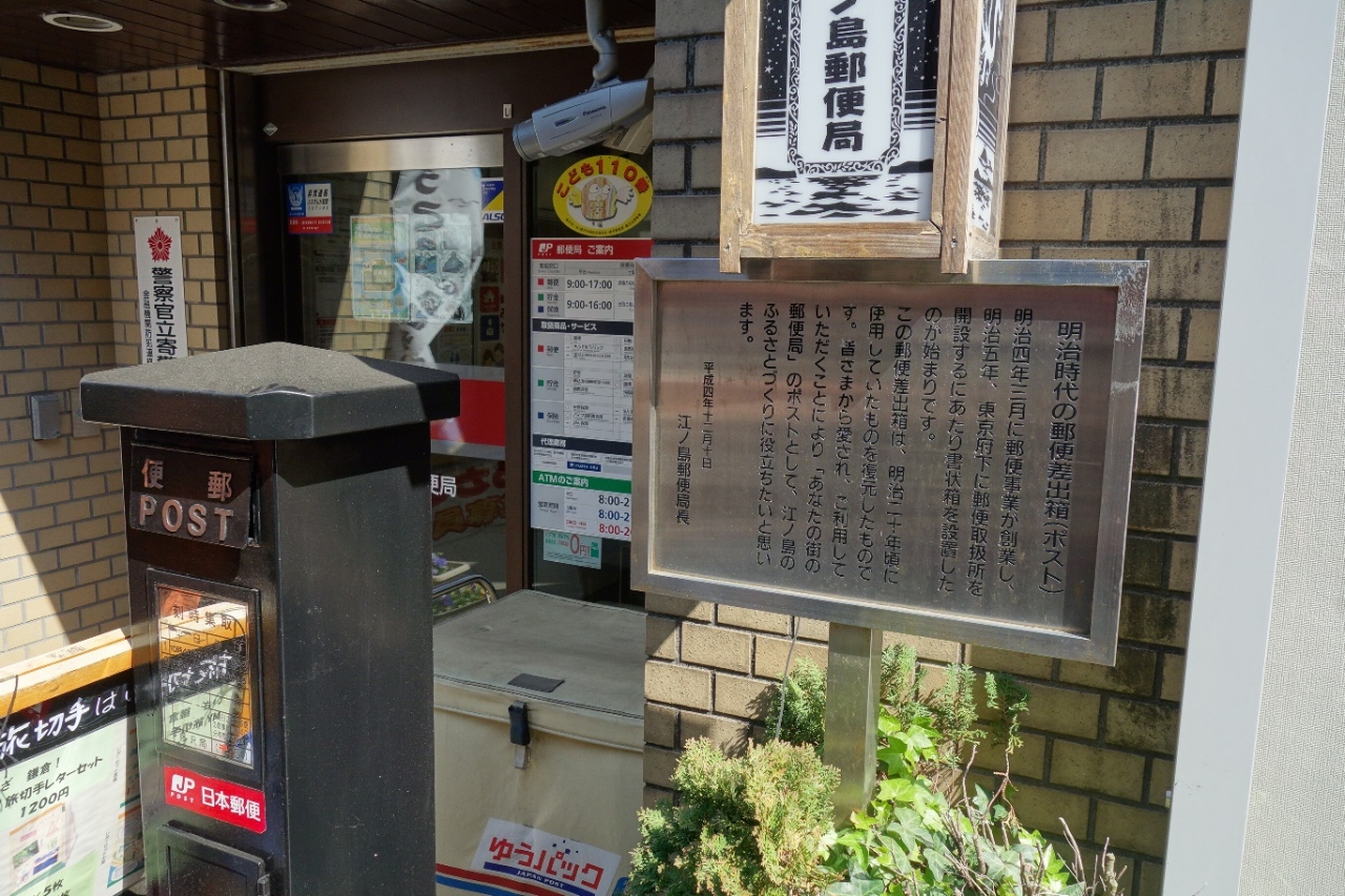 江の島の弁天仲見世通りを歩いていると地元の郵便局がありました。通りに面したところに郵便ポストとその説明板がありました。ポストは赤くなくて四角い黒いもので、明治時代のものを復元したそうです。ポストは赤とイメージがあったので新鮮な印象でした。