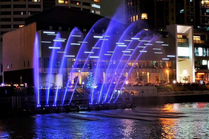 公会堂のイルミ撮影を終えて、今年の大阪光のルネサンス最後の撮影は、西地区でやっている「ウォーターファンタジア」です。行ってみると、こちらは人影がまばらです。グルメが出ていないので、しようがないのかもしれません。しかし、これもなかなか難しいですね。最後に七色に変わるのですが、意外と時間が短い。15分に1回、放水していますが、なにぶん今日は寒いです。長居が出来ないので、ほどほどで帰りました。