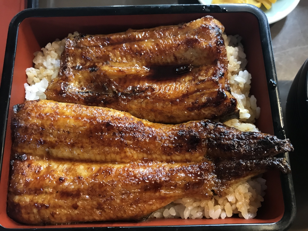 15分くらいたって重箱が配膳されて、蓋を開けると、お重一杯のウナギが。食べると身も分厚く。こんなウナギ食べたことがありません。遠くからわざわざ食べにくる人がいるのも納得です。