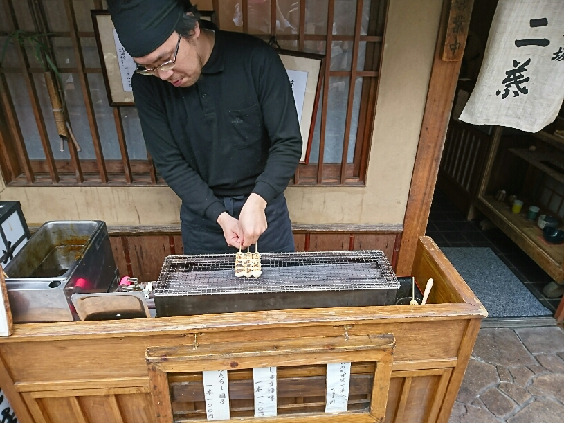 二寧坂にあるおそば屋さんです。一本100円(しょうゆ団子は150円だったかと)のみたらし団子を買いました。店の前で焼かれ、焦げ目をつけられた団子は熱々でやわらか。たれも甘すぎずおいし~♪食べ歩きにちょうどよかったです
