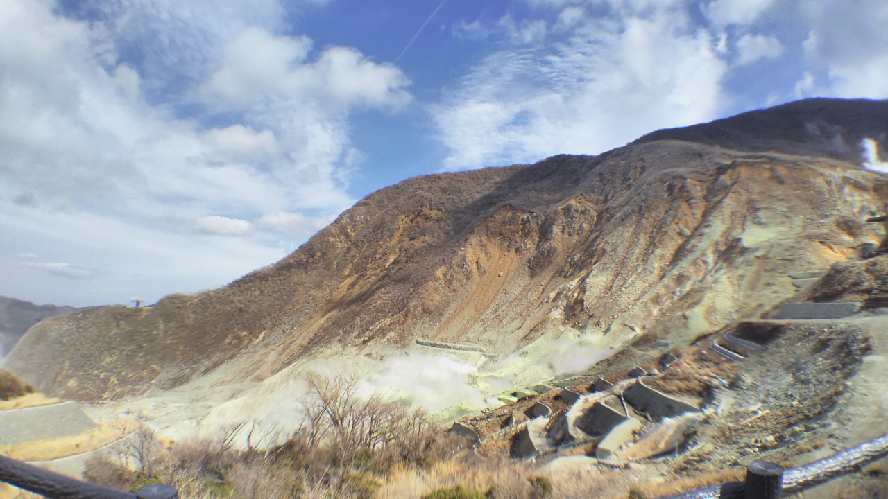 まだ奥のほうへは入場規制されています。遠くから黄白色になった山肌を眺める感じでした。この日は硫黄のにおいもそれほどありませんでしたが、風がものすごく強かったです。大分の地獄巡りのほうも行ったことがあるのですが、そちらのほうがより近場で見えてインパクトがあるように感じました。