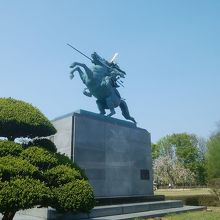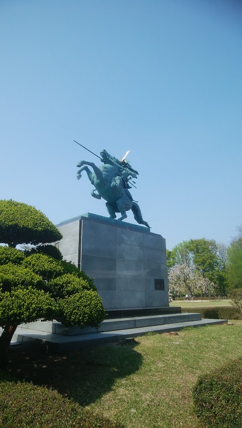 山形駅周辺を散策した時に霞城公園内をぶらぶらしていて見つけました。このブロンズ像はかなり大きく、高さのある石組の台座に乗っていて、ブロンズ像もかなり大きなものなので、少し離れてみても圧倒的な迫力があります。馬にのっている、兜をまとった、最上義光公の力強さを強く感じるものであり、その馬の姿も前足を立たせて、これから一気に走りだそうとする姿で躍動感が半端なく感じるものであります。単なるお殿様のブロンズ像というだけでなく芸術作品だと思います。