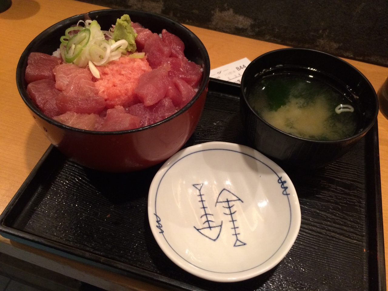 スタンドひおきはその名の通り、立食となるが、マグロの中落ち丼は600円で味噌汁までついてくる。