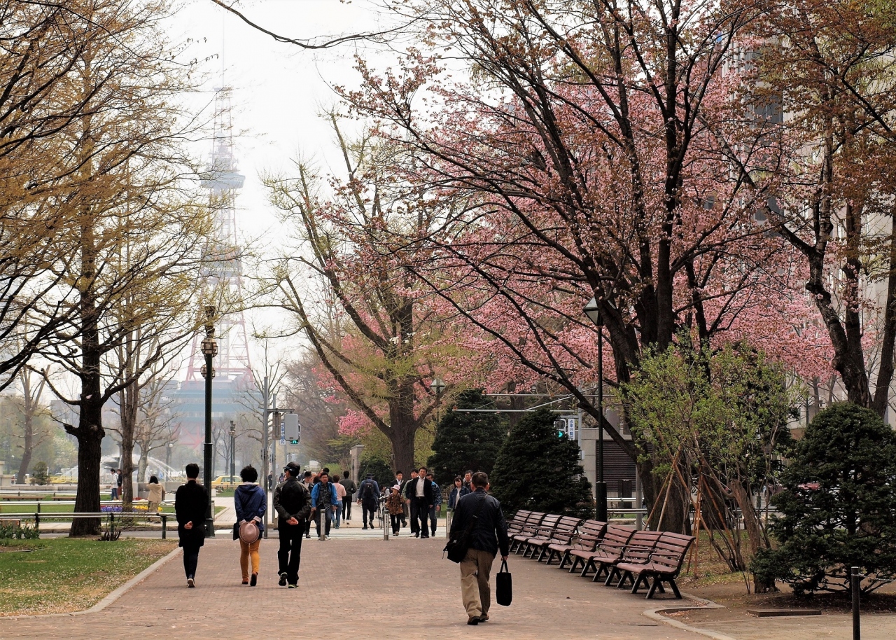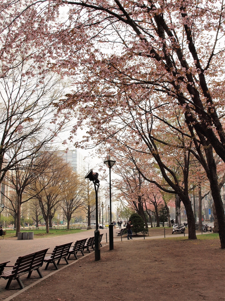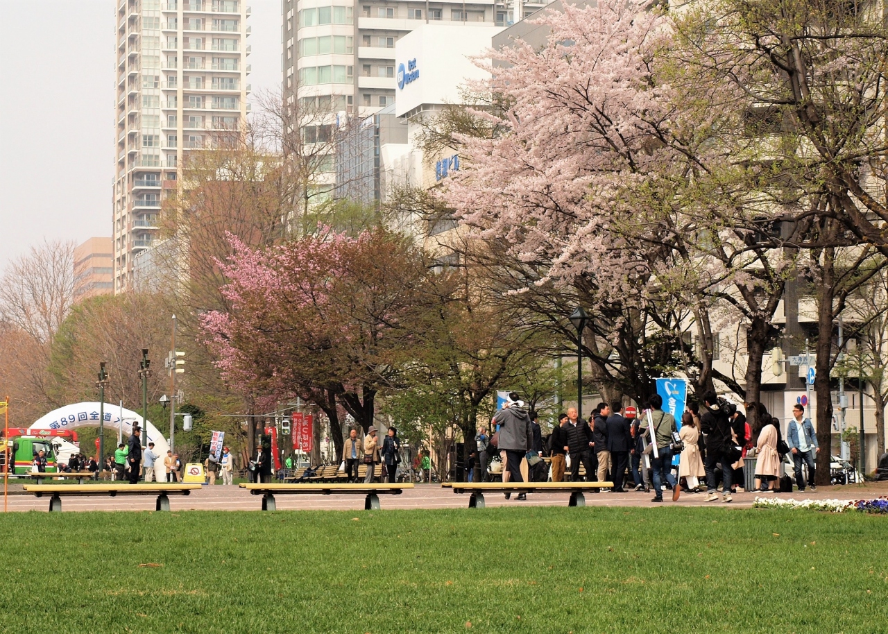 5月1日朝の大通公園でもそこかしこに桜が咲きだして、道行く人々の目を楽しませていました。