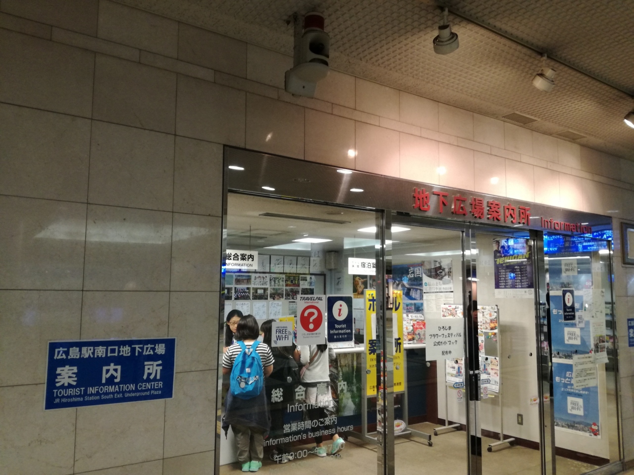 広島駅南口を出て、エスカレーターで地下に下りると広場があり、その一角にこの案内所がありました。パンフレットなども多く置いてあり、外国人にも対応しているようです。ただ、広島駅の改札からは少し離れて目立たないような場所にあるので、もう少し観光客の目につきやすい場所にあればいいのにと思いました。