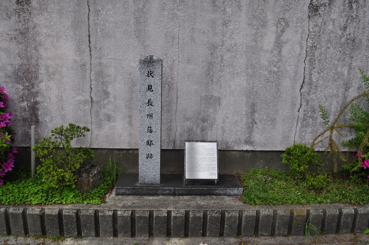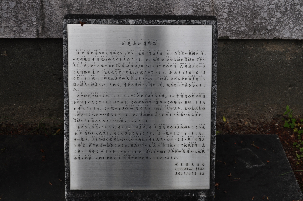 伏見みなと公園のすぐ近く、115号線沿いにこちらの石碑と案内板が設置されています。幕末に起きた禁門の変において福原越後らに率いられて挙兵した長州藩勢は伏見街道の稲荷付近で大垣・桑名・会津・鯖江の藩兵たちと衝突、敗走して館で再起を図っていた際に、彦根藩などの連合軍が京橋より伏見長州藩邸を砲撃、藩邸は焼け落ちてしまったとの事でした。あまり幕末の事の歴史は詳しくないので、このように詳細に書かれた案内板というのは非常に勉強になります。