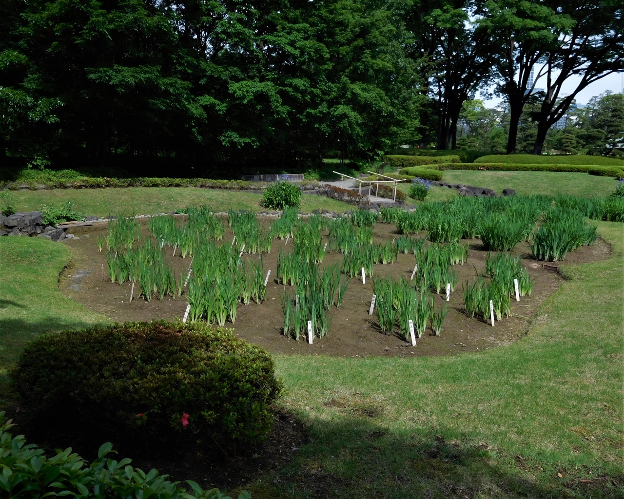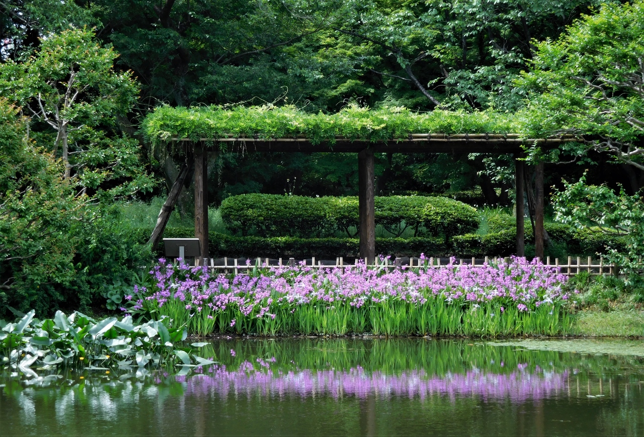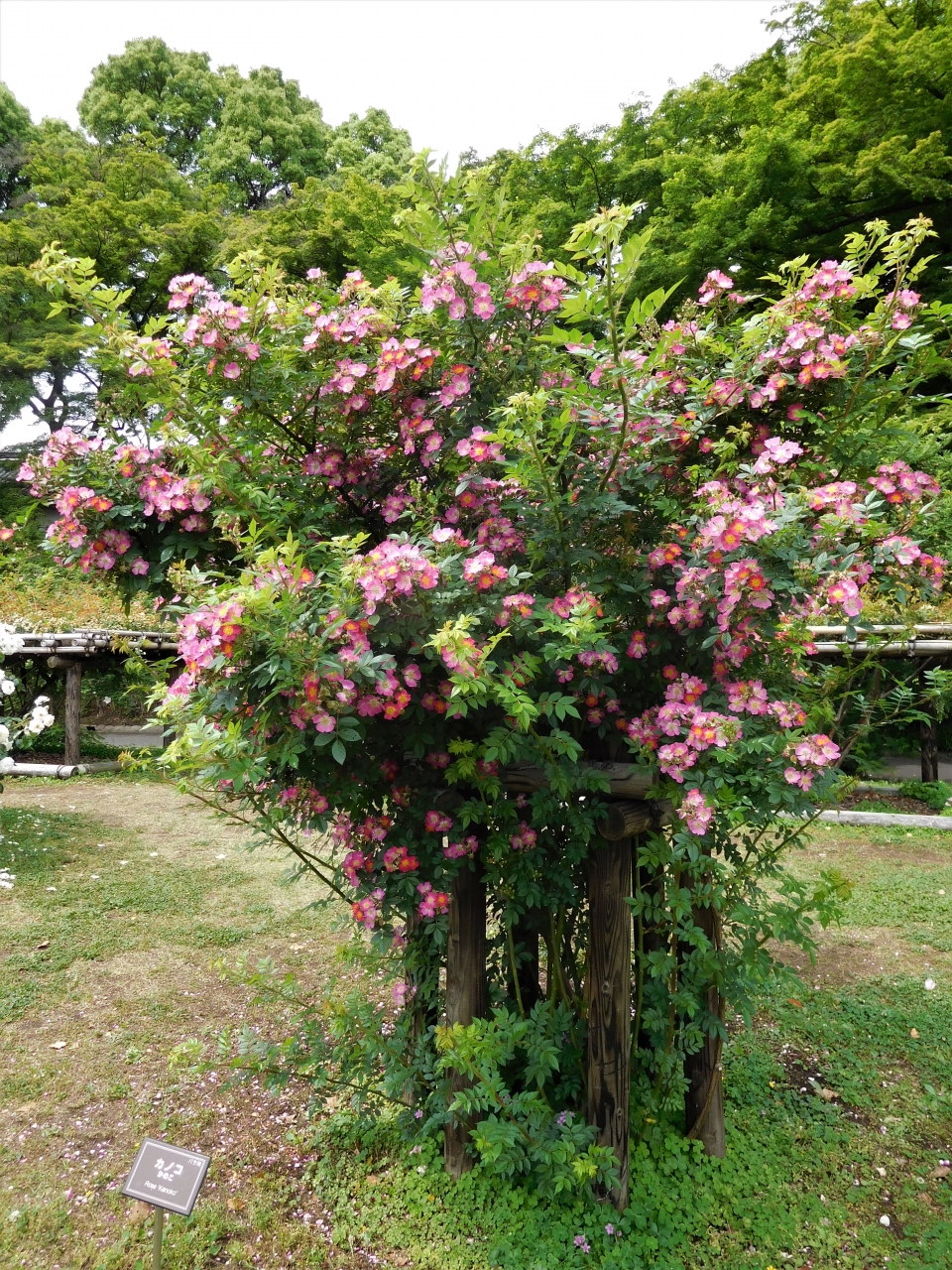 二の丸庭園では名前が分からないけど藤棚の近くにピンク色の花が咲いていました。