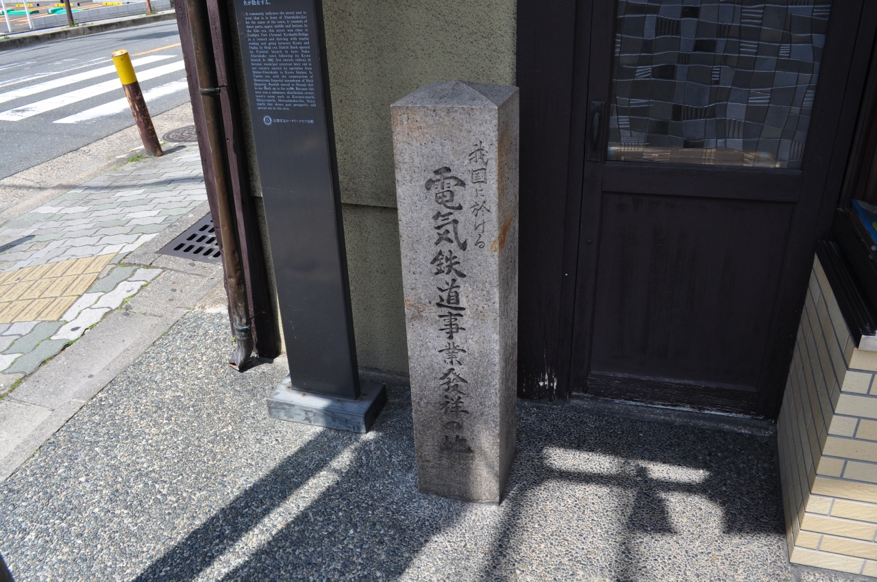 明治28年2月に、ここ伏見と京都駅との間で日本初の電気鉄道が開通しました。当時の京都は琵琶湖疏水がつながったことで、その琵琶湖疏水を利用した水力発電による電気があり、その電気を使って電車を開通させたとの事です。約6キロという短い区間ではありますが、当時の方にとっては大変貴重な足となったのでしょうね。京都駅のすぐそばにも同じ内容の石碑がありますので、併せて見学されるとより理解も深まってよいかと思います。