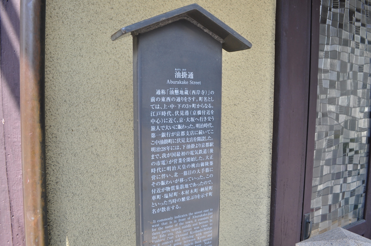 京都伏見の油掛町を東西に延びる通りが油掛通と呼ばれていたようです。おそらくは西岸寺の油懸地蔵尊が名前の由来になったのでしょうね。現在は地図上では魚屋通という名前が使われているようですが。油掛通沿いには「電気鉄道事業発祥の地 」があり、かつてはここと京都駅の間で電車(市電)が走っていたそうです。現在ではあまり活気のある通りではないのですが、かつては賑わった通りなのでしょうね。通り沿いにはお店もいくつかありましたが、あまり人通りは多くはなかったです。