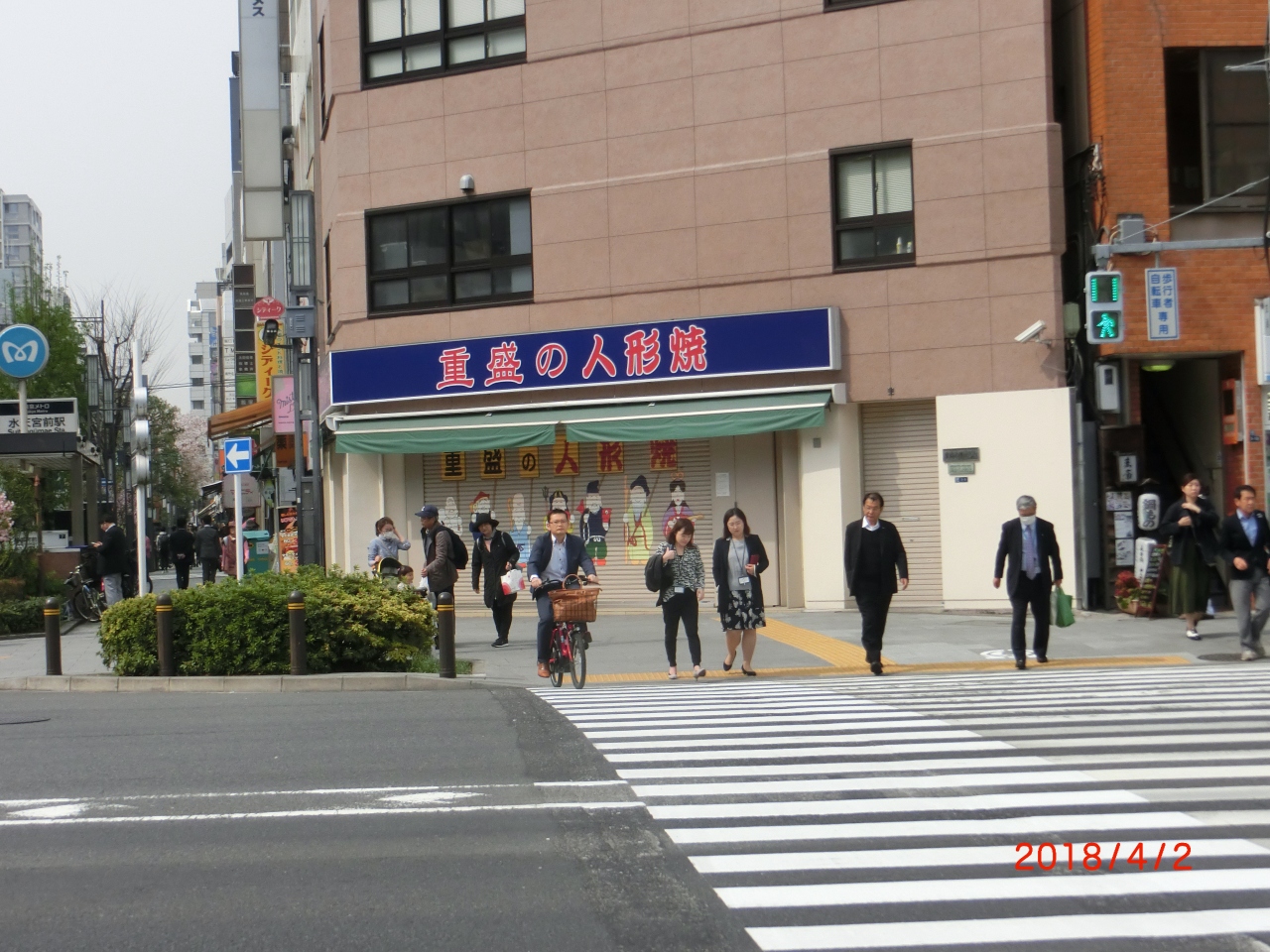 重盛の人形焼は、玄冶店跡の反対方面の水天宮交差点にありました。