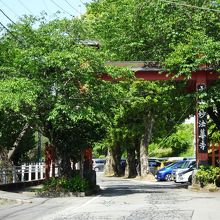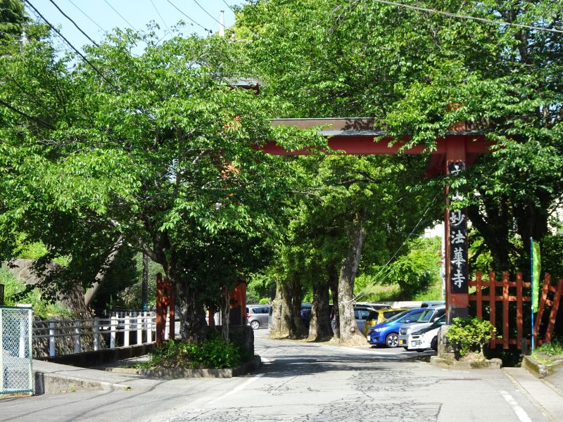 道路をどんどん上っていくと、道路をまたぐ赤い大きな山門が現れ、そのままお寺の中に吸い込まれました。