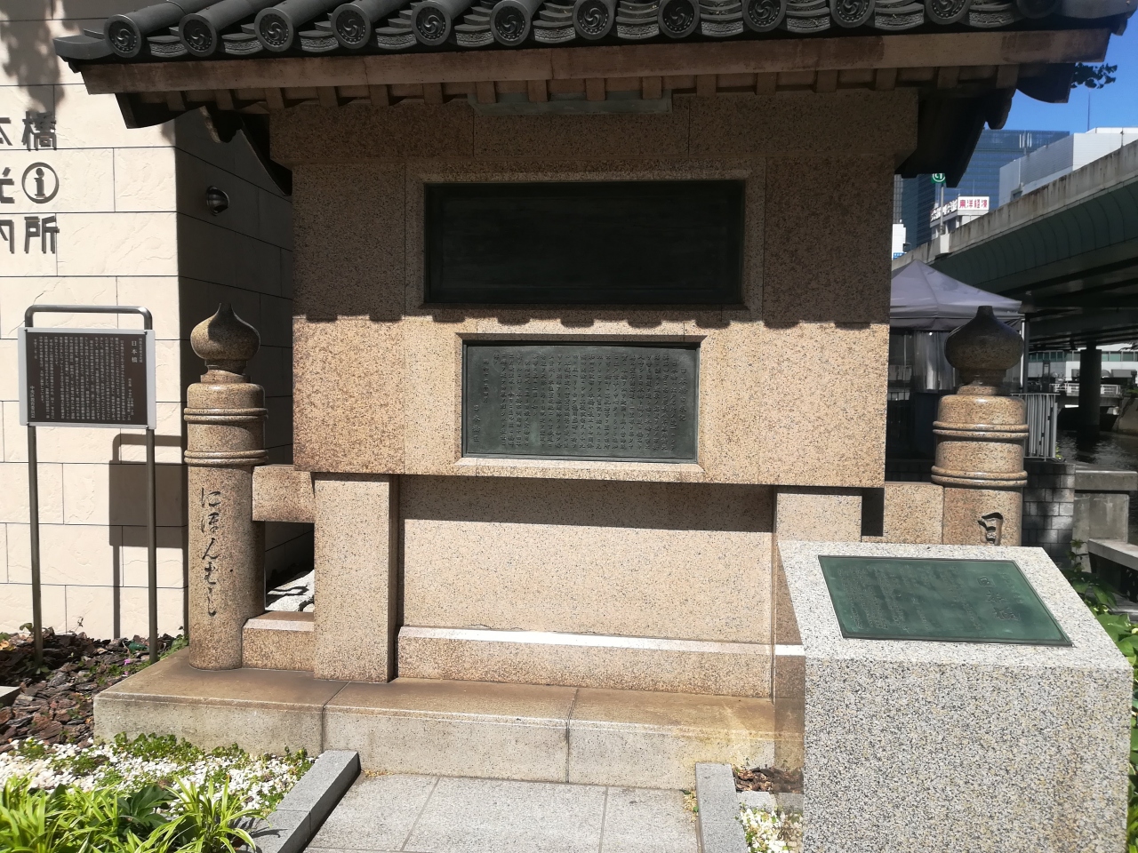 日本橋の北西、いわゆる花の広場に設置されていました。さすが日本の道路の基点といわれる日本橋の由来碑だけあって、大きな立派なもので、私的には珍しく屋根付きの石碑になっていました。ただ、古いものなので碑文の意味はさっぱりわかりませんでした。