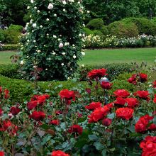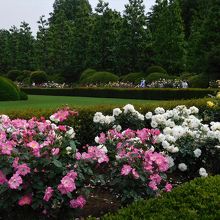 フランス式整備庭園のバラ花壇でいろいろな種類のバラを楽しみました。