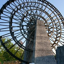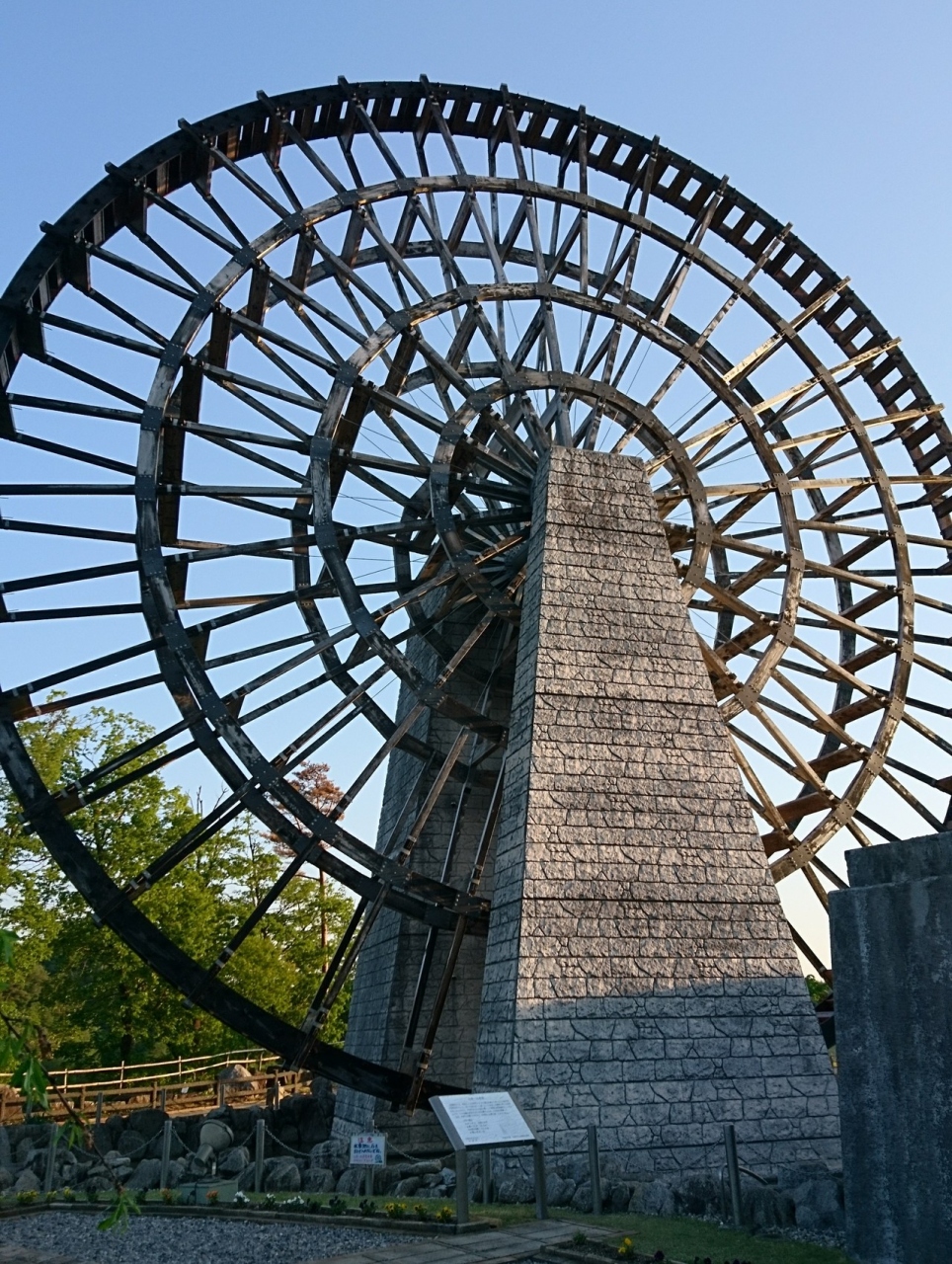 道の駅にあるこの巨大な木製水車はとても見ごたえあるもので、遠くから見ると観覧車が回っているように見えます。木製水車は水をくみ上げ独特のきしむ音がしてみていて飽きません。
