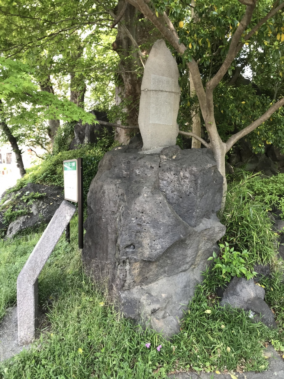三島神社の別当職を務めた愛染院という大寺院の跡だそうです。あまり大きくはなく、見てもそこに寺院あったとはよくわかりません。溶岩の跡があるくらいで、正直見ても案内板がなければ何が何だかわからない場所です。