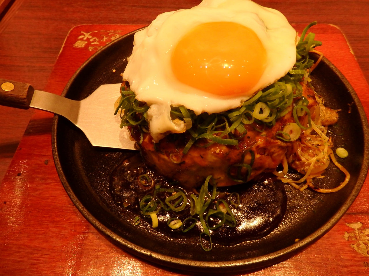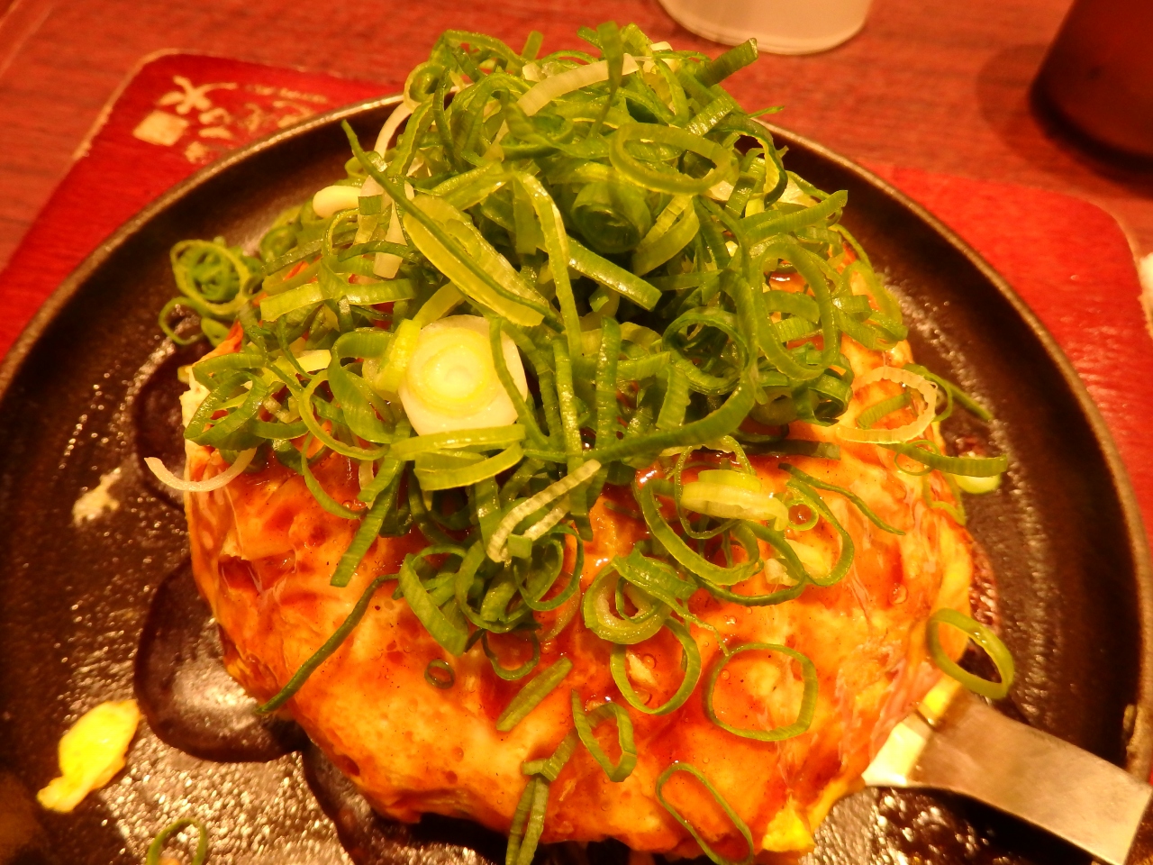 ドーム型のお好み焼き。家族3人とも中身は焼きそばにした。私と娘は一番人気の「電光石火(店名と同じ)1260円」を注文。夫は上に目玉焼きが乗り、中の具材が少し違う「夢1460円」を注文。「電光石火」は中に大葉が入っていて美味しい。九条ネギもたっぷりのっていて風味が良い。
