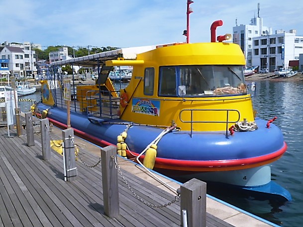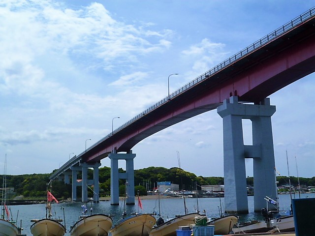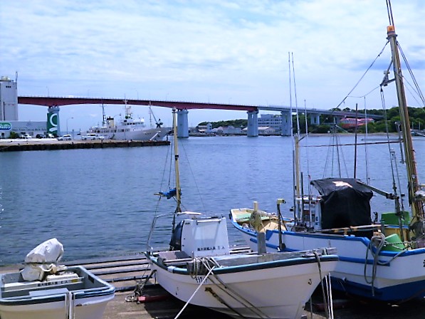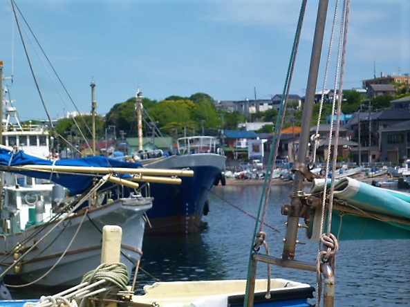 東海岸ドライブコース;県道215号の三浦海岸から三崎港を走っていましたが、いよいよゴール間近に。真上にある城ヶ島大橋をくぐると[三崎漁港];正午頃だったので漁船は岸壁に。マグロ船は?…素人なので全然分かりませんがきっと大きな漁船ですよね;今も操業中?。直ぐ傍には`産地センターうらり`/遊覧船もありました。