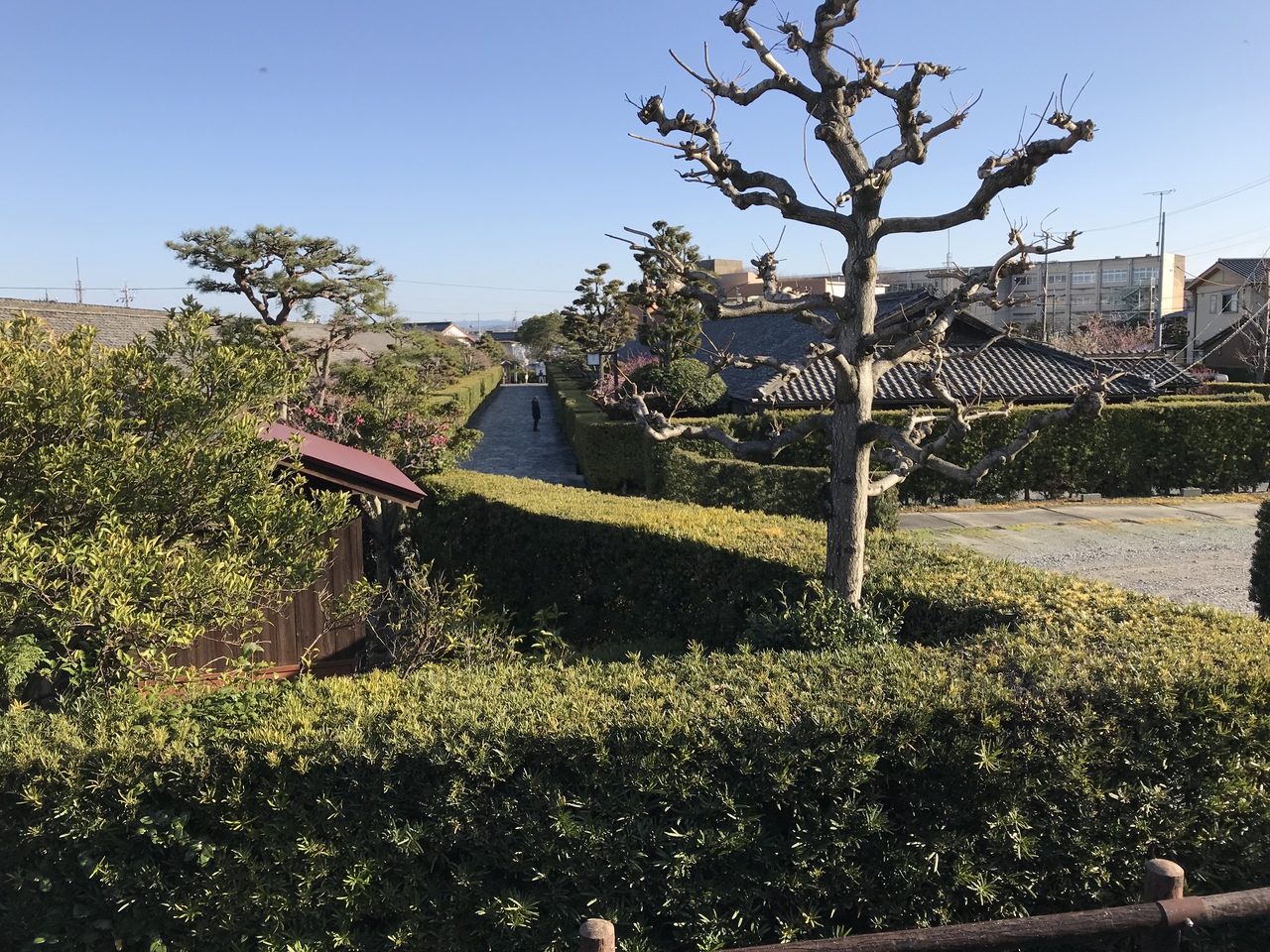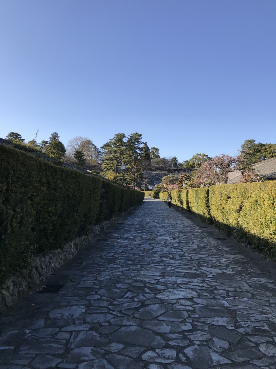石垣の上に美しく整えられた緑の生垣が真っ直ぐに並んでる光景には目を見張るものがある。