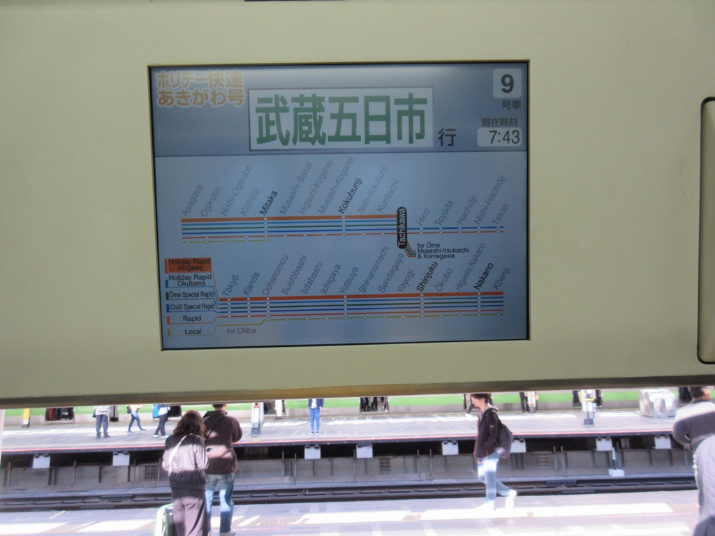 新宿始発の特別快速電車。前4両が武蔵五日市行きあきがわ号、後6両がおくたま号です。あきがわ号は比較的空いていて、始発駅でだいたい座れます。ただ、5月連休と紅葉の時期は混みあうことがあるので、駅に早めに行って待つ方が良いです。