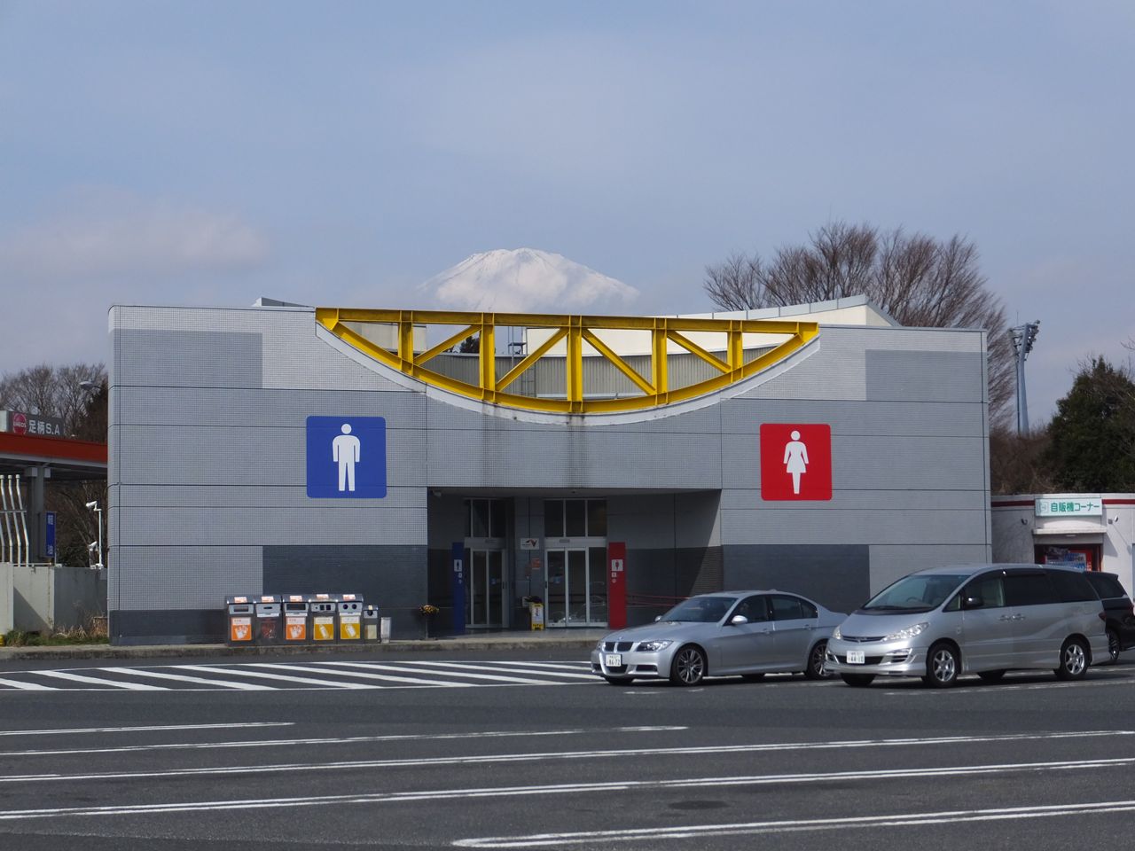 久しぶりに足柄サービスエリアの下り線を利用すると、本館?の駐車場挟んで反対側に大きなトイレの建物ができていました。本館側に比べて圧倒的に空いていて穴場でした。建物の上に富士山がぽっこり浮んで楽しい構図になりました。
