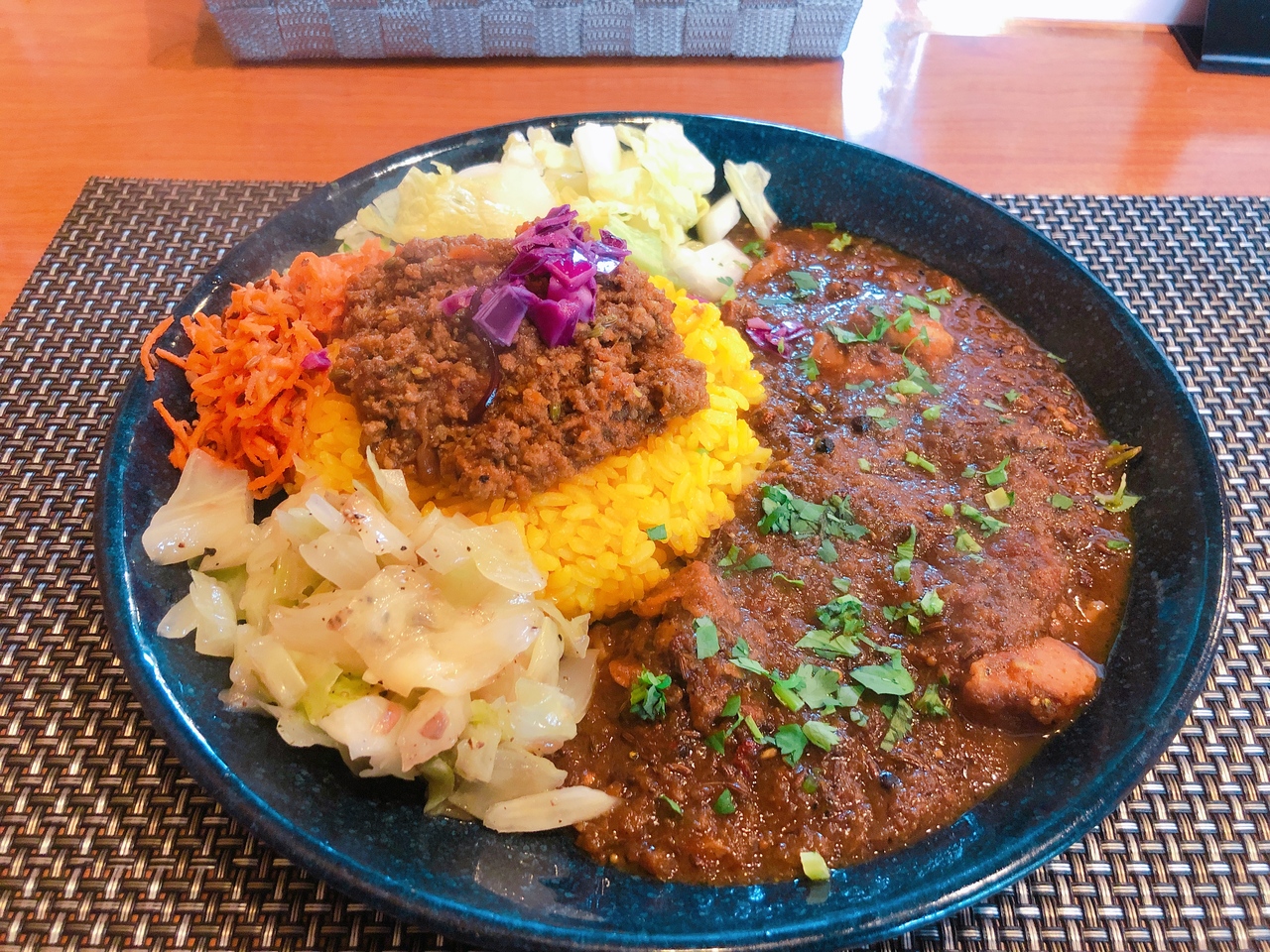 カレー定食2種盛り(スパイシーチキンとポークジンジャーキーマ)1100円をオーダー。