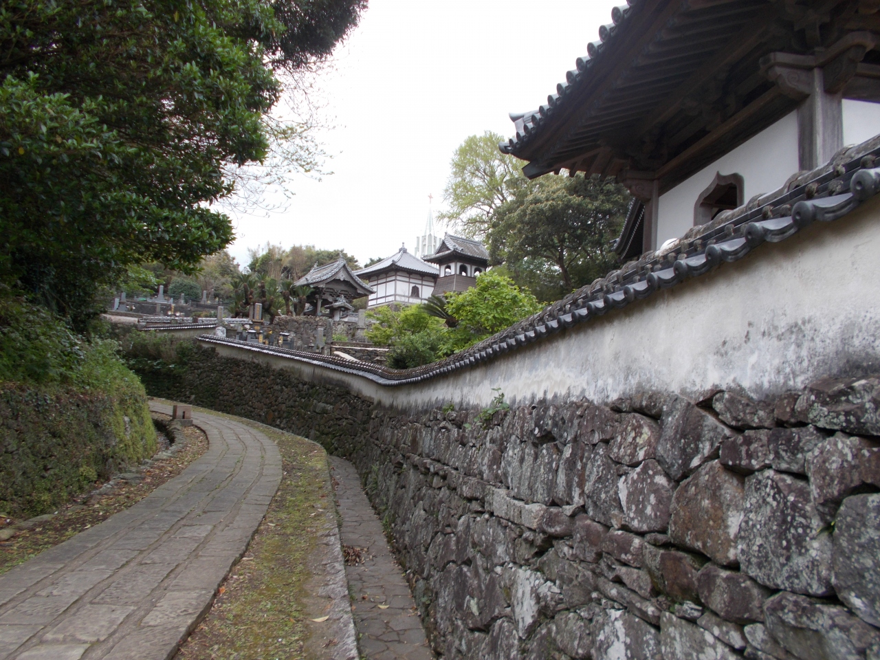 この寺院と教会が見える風景は瑞雲寺の前の石段を登るとザビエル記念教会の尖塔部分が見えてきます。瑞雲寺の隣の光明寺の山門が見えます。その山門あたりからの展望が寺の白壁越しに見える教会の景観が不思議な印象を持ちます。一瞬その景観を見つめたそしてこのような景観がまた素晴らしいと感じました。今の時代だからこそです。