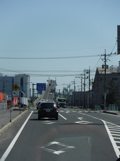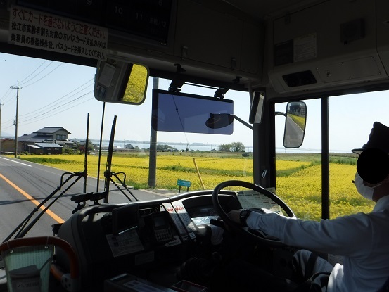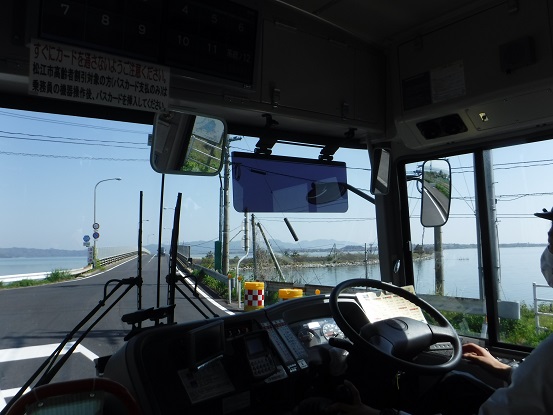 松江しんじ湖温泉駅前から境港駅前まで、一畑バスの松江境港シャトルバスで移動しました。松江しんじ湖温泉駅前から松江城、松江駅前を経由し、大根島を通り境港駅前まで、1時間弱、1000円で乗ることができます。中海を通過する大根島までの海の道、大根島ののどかな景色、そして通称べた踏み坂の江島大橋を楽しみながら、あっという間に境港に着きました。とても楽しい路線です。