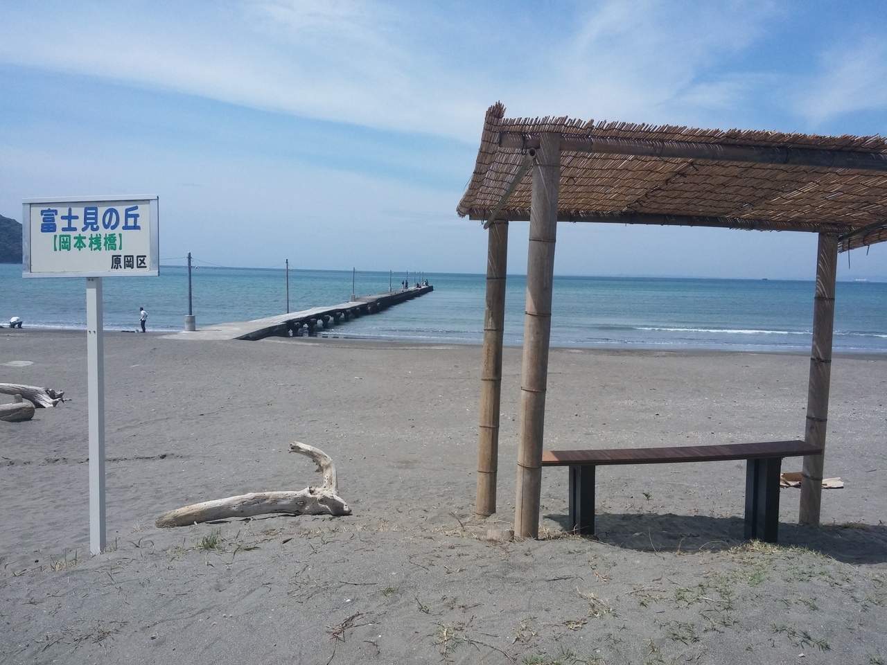インスタ映えすると最近話題になっている原岡海岸の木製桟橋。確かに柵など全くなく真っ直ぐに海に延びる姿は面白いかも。訪れたのは昼間だったので夕暮れの方がレトロ感がでそうです。浜辺に設置された富士見の丘休憩スペースが癒されました。ゆっくりした名所で癒されます
