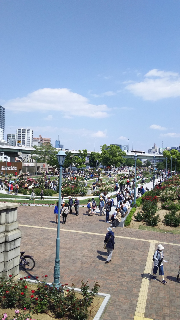 ゴールデンウィーク、中之島ばら園のバラが満開でした。晴天のもと、爽やかな風に吹かれて、いい香りが辺り一面に漂い、とても癒される空間を演出していました。老若男女、みなさん笑顔で楽しいひとときを過ごされているようでした。