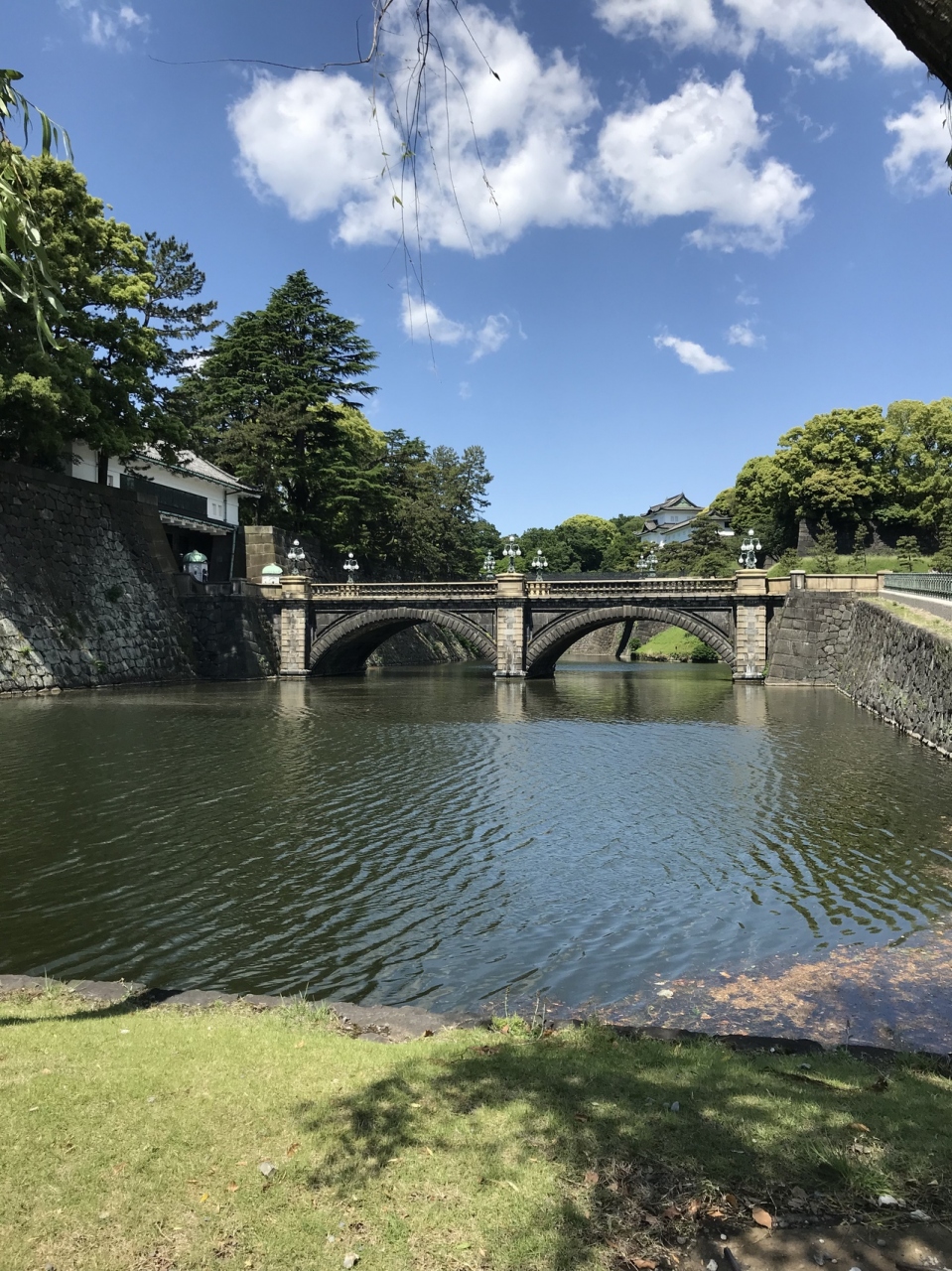 皇居前広場から正門を経て宮殿へと至る豪に二つの橋がかかっております。手前の橋が正門石橋といい、奥の橋が正門鉄橋といいます。二重橋は二つの橋と誤解されることもありますが、厳密には奥の橋を指しているそうです。写真スポットです。
